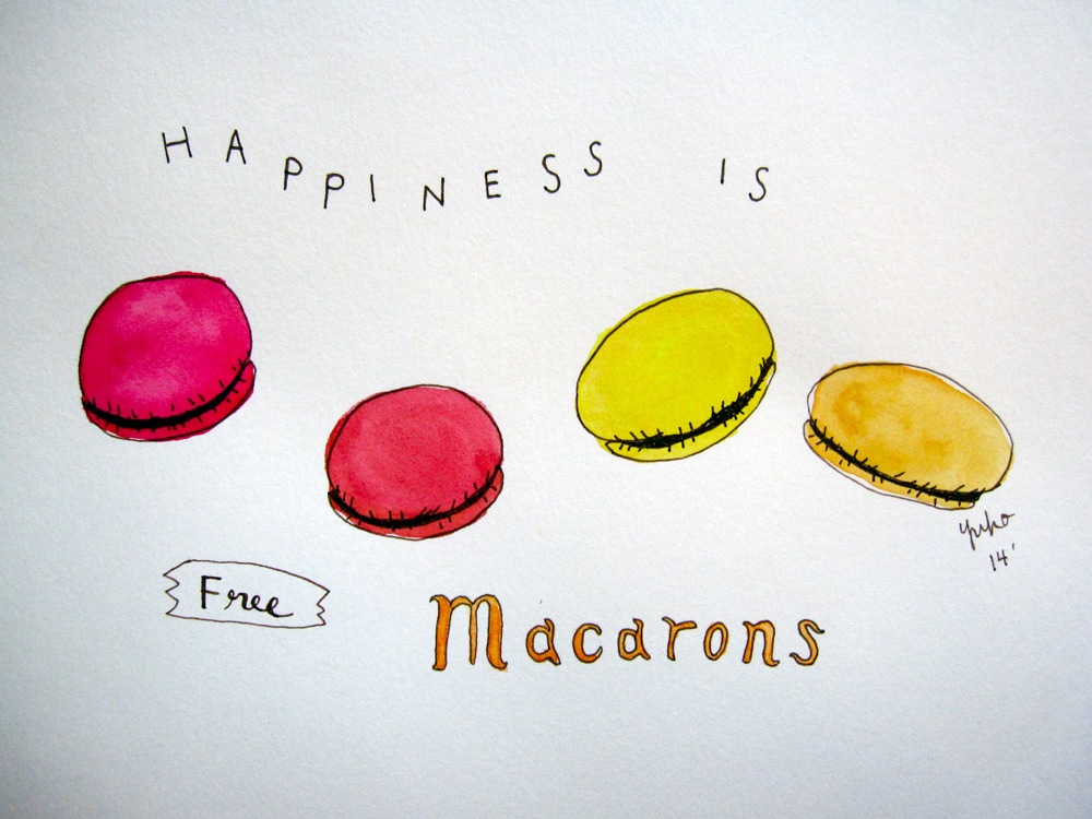 Happiness is: Day 110 August 5, 2014365 day illustration challenge, Food, Hand Lettering, Illustration, Pen & Ink, Watercolorhappiness, Macarons, ParisYuko Happiness is free macarons! Paris day 5.