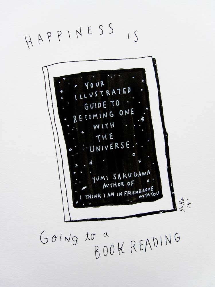 Happiness is: Day 214 November 17, 2014365 day illustration challenge, Hand Lettering, Illustration, Pen & Inkbook, happiness, your illustrated guide to becoming one with the universeYuko Happiness is going to a book reading.