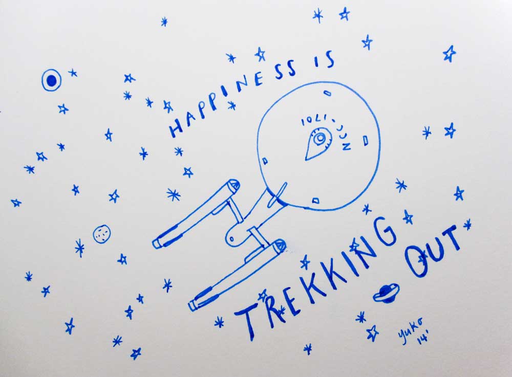 Happiness is: Day 211 November 14, 2014365 day illustration challenge, Hand Lettering, Illustration, Pen & Inkhappiness, space, star trekYuko Happiness is trekking out.