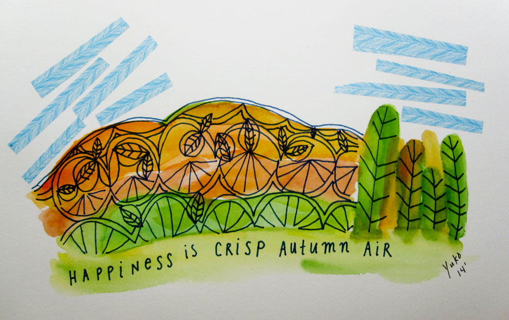 Happiness is: Day 169 October 3, 2014365 day illustration challenge, Abstract, collage, Hand Lettering, Illustration, Nature, Pen & Ink, Watercolorautumn, happinessYuko Happiness is crisp autumn air.