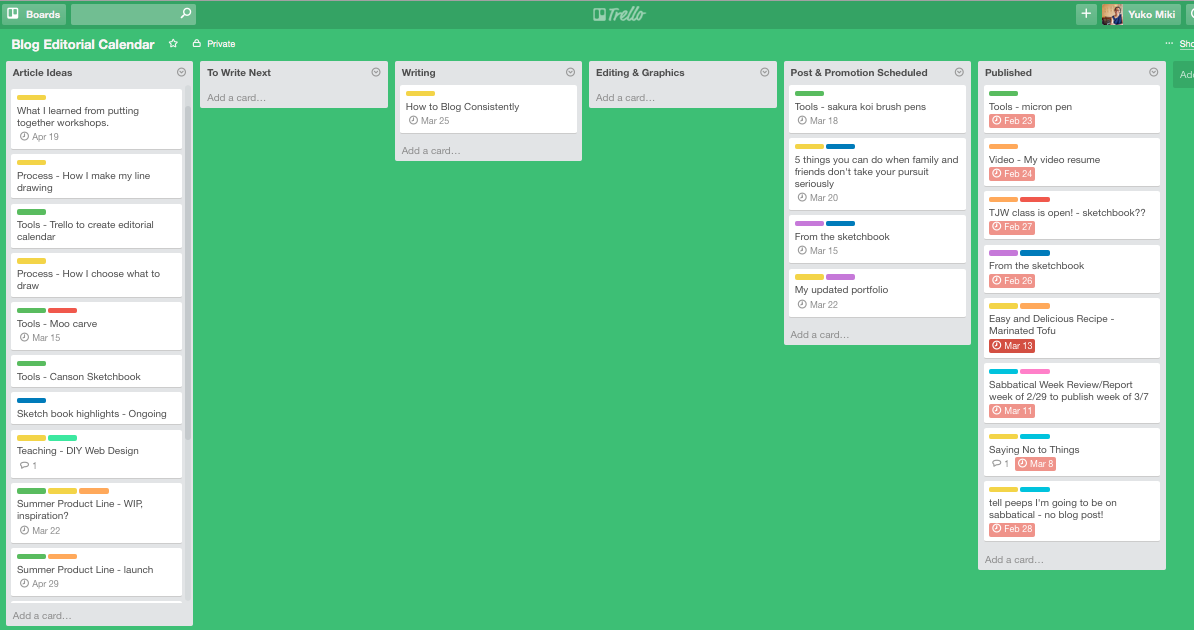 You can add categories to each card (i.e. your virtual sticky note) if you want to. My general categories include themes like Products & Services, Tools & Product Review, Processes, Lifestyle, DIY, Art & Illustration, and Self-Care. You can see the list of categories (it’s called Labels here.)