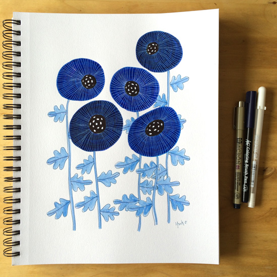 I used the red ink for the flowers and navy blue for the leaves. Pretty, yes ?