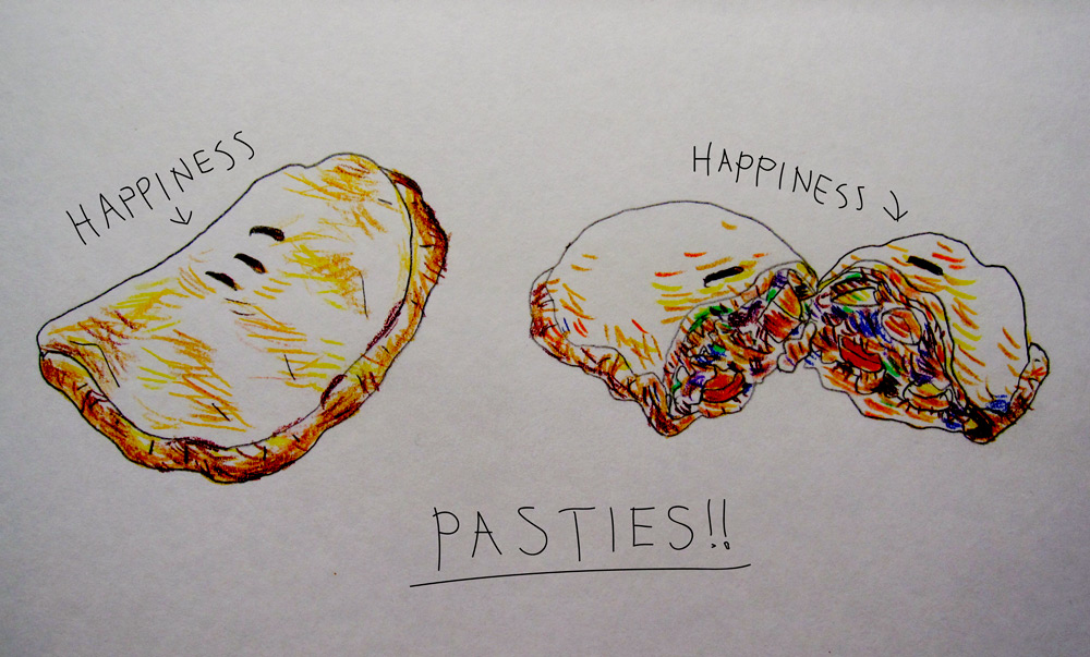Happiness is: Day 9 April 26, 2014365 day illustration challenge, Colored Pencil, Food, Illustration, Pen & Inkhappiness, meat pie, pasties, yumYuko Pasty ( \ˈpas-tē\) is a meat pie full of yummy happiness.